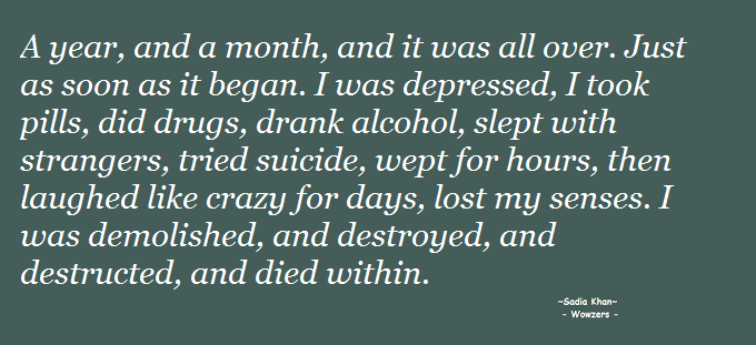 A year, and a month, and it was all over. Just as soon as it began. I was depressed, I took pills, did drugs, drank alcohol, slept with strangers, tried ending my life, wept for hours, then laughed like crazy for days, lost my senses. I was demolished, and destroyed, and destructed, and died within.